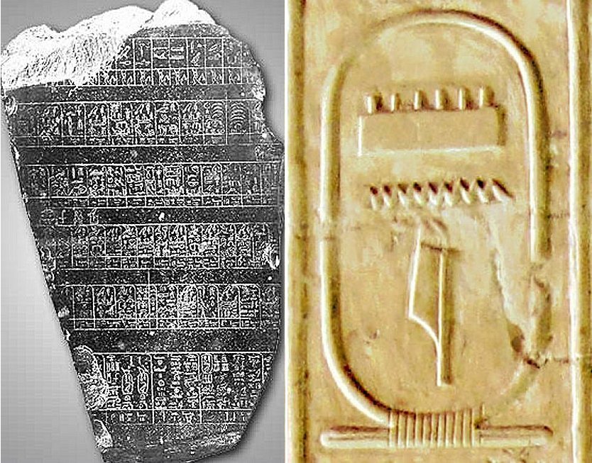 Derecha: El cartouche de Menes en la lista de rey de Abydos.